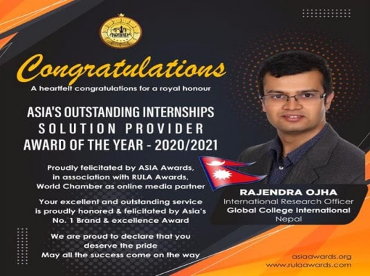 काठमाडौं, नेपालका युवा अनुसन्धानकर्ता राजेन्द्रप्रसाद ओझा एसियाली मुलुककै सबैभन्दा उत्कृष्ट एसिया अवार्डमा आधारित एशियाज आउट स्ट्यान्डिङ इन्टर्नशिप सोलुसन प्रोवाइडर अवार्ड २०२०÷२१’द्वारा सम्मानित भएका छन्। यसैगरि उहनलाई यसै सँस्थार्ले युवा अन्तर्राष्ट्रिय अनुसन्धान अफिसरका रुपमा मनोनयन गरेको छ ।