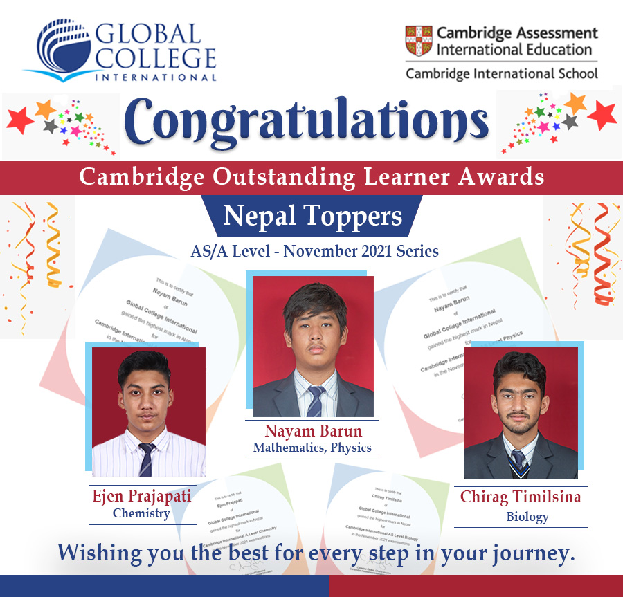 ग्लोबल कलेज इन्टरनेसनल AS/A Level – November 2021 Series का ३ जना विद्यार्थीहरु “Cambridge Outstanding Learner Awards” का विजेता भएका छन् । ग्लोबल कलेज अन्तरगत A Level विद्यार्थीहरु र ग्लोबल कलेज परिवारलाई Cambridge Assessment International Education-Cambridge International School ले बधाई का साथै उज्वल भविष्य र प्रगतिका लागी शुभकामना व्यक्त गरेको छ । Cambridge Assessment International Education-Cambridge International School सँग सहकार्य गरी ग्लोबल कलेज इन्टरनेसनलले विगत वर्षहरु देखिनै A Level Program मा सबै सुविधाका साथै उत्कृष्ट, आधुनिक शैलिमा विद्यार्थीहरु लाई पढाउँदै आएको छ । उच्च शिक्षामा Erasmus + क्षमतावृद्धिसँग सहकार्य गर्ने नेपालको पहिलो कलेजको रुपमा ग्लोबल कलेज आउँछ । काठमाडौंको मध्य बानेश्वर मा अवस्थित ग्लोबल कलेज ख्याती प्राप्त शैक्षिक संस्थाको रुपमा चिनिन्छ । Global College International मा ब् ीभखभ िक्ष्लतबपभ द्दण्द्दद्द को लागी भर्ना खुला गरेको छ । योग्य विद्यार्थीहरुका लागी छात्रवृत्ति उपलब्ध छ ।