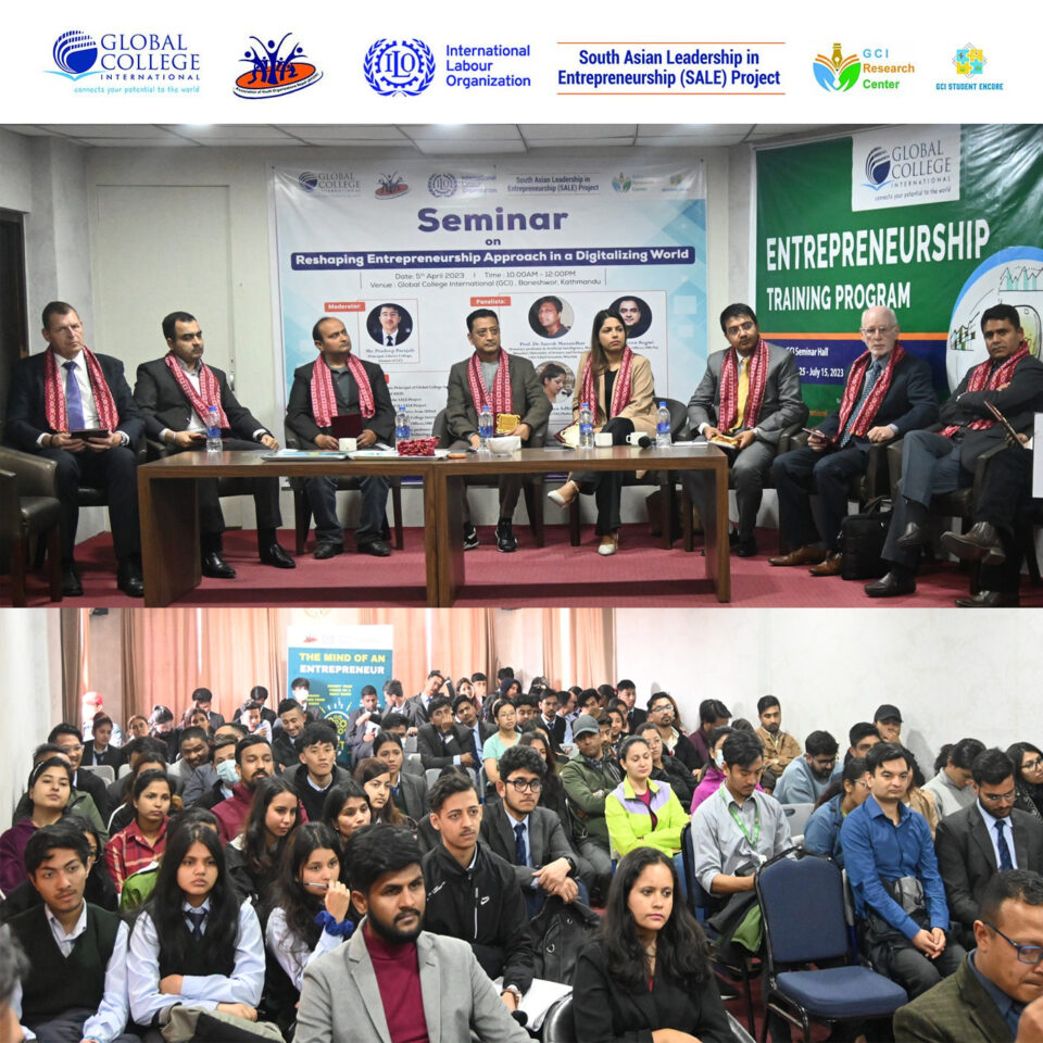 Global College International (GCI) in collaboration with Association of youth Organization Nepal and International Labor Organization’s South Asia Leadership in Entrepreneurship project successfully hosted a seminar on Reshaping Entrepreneurship Approach in a Digitalizing World on April 5th, 2023. The event was held at the GCI campus in Baneshwor, Kathmandu, from 10:00 AM to 12:00 PM.